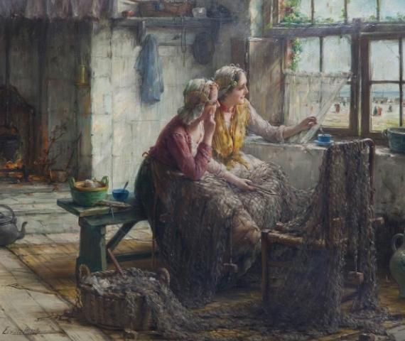 Zeeland interior with two fishermen's wifes dreaming near the window