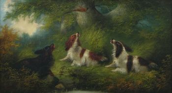 Three Spaniels flushing out a Grouse