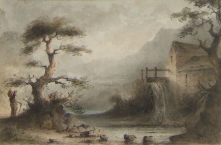 Traveller in Landscape by an Old Watermill