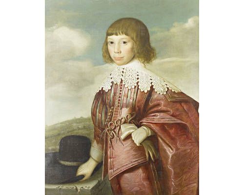 | Portrait of a young boy, three-quarter-length, in pink silk embroidered dress and a white chemise, standing beside a stone ledge | |