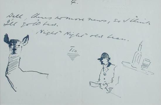 | Signed greetings note depicting a deer and a huntsman - "Well, chums no more news, so I think I'll go to bed, Night night old be | |