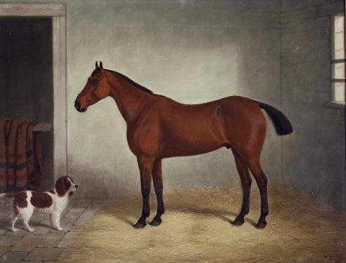 | Portrait of a Chestnut Hunter in a Stable Interior with a Spaniel beside | |