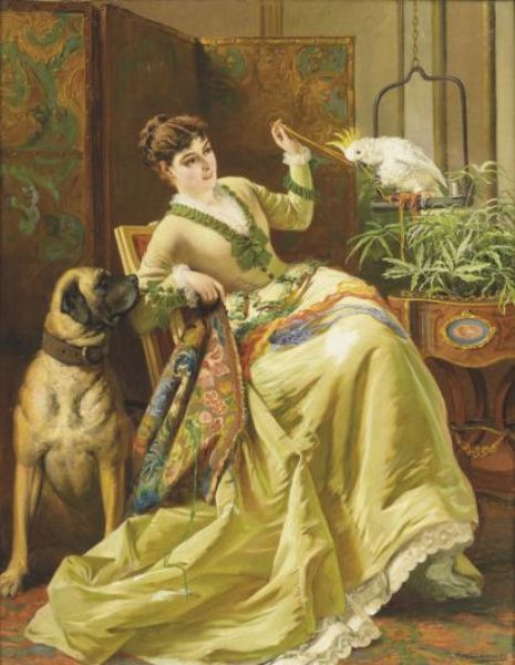 Élégante avec son chien et son perroquet