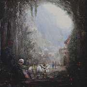Oxen, monkey and figures before a temple in a mountainous landscape