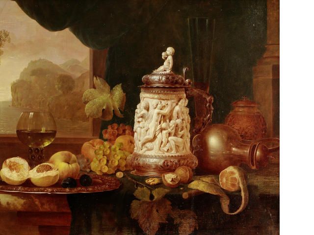 | A still life of an ivory tankard and fruit on a table-top, in a wavy ebonised moulded frame | |