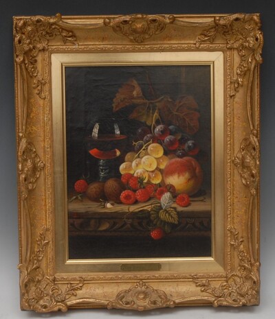 Peaches, Raspberries, Walnut, Glass on a Ledge