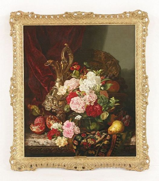 | STILL LIFE OF ROSES IN AN EWER AND POMEGRANATES AND OTHER FRUIT ON A MARBLE LEDGE | |