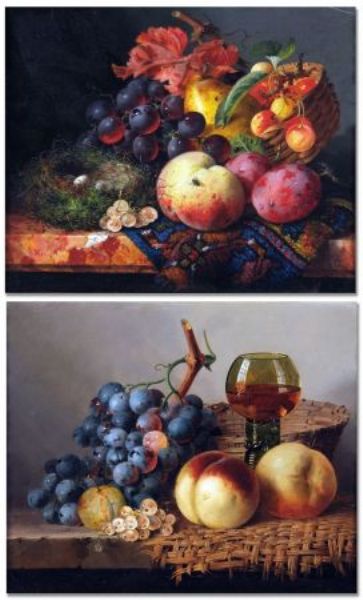 | Still Life Study of Mixed Fruit, Basket, Wine Glass and Birds' Nests on a Marble Ledge | |
