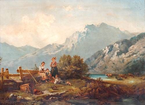 Alpine scene with figures of children and cattle in the foreground