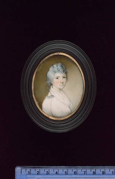 | A Lady, wearing white dress, the collar trimmed with blue, white fichu, her hair curled and powdered. | |