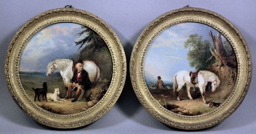| Huntsman leading his horse and huntsman and his dogs resting with his horse | |