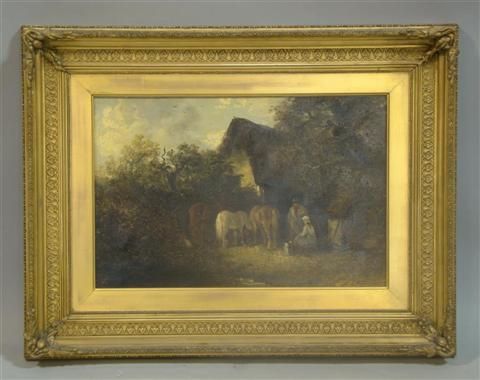 COUNTRY FOLK WITH HORSES OUTSIDE THEIR COTTAGE