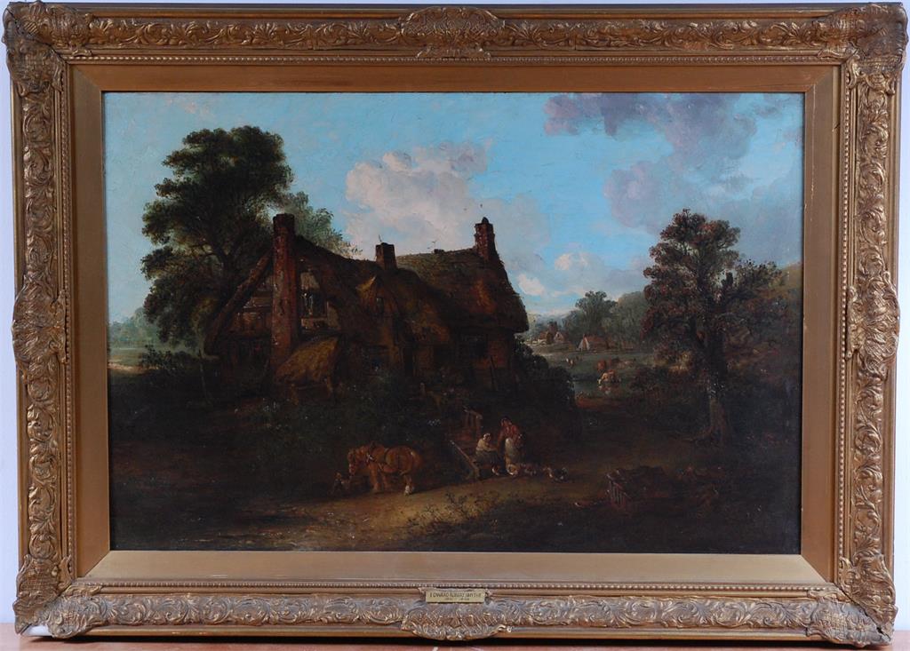 Figures feeding chickens outside a cottage