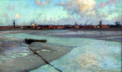 | East Anglian coastal scene with town and windmills in background, a boat wreck in foreground, low tide | |