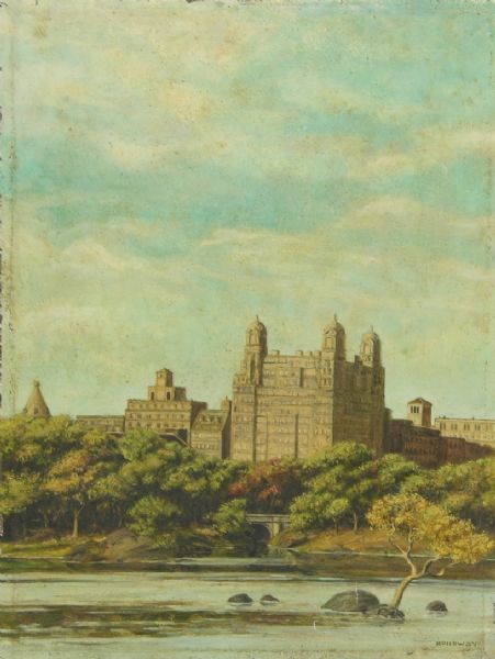 | A landscape with a river in the foreground and some imposing buildings in the distance | |