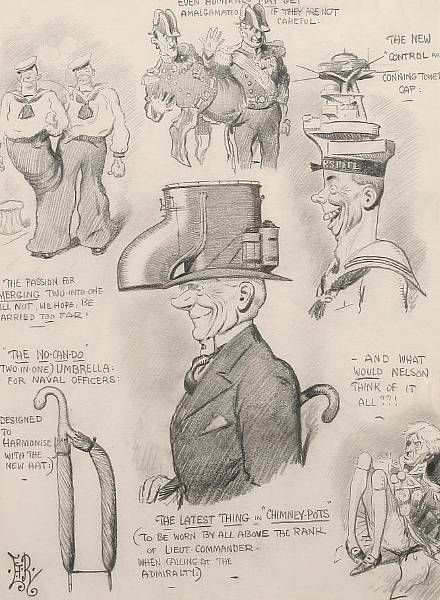 | A caricature on the Royal Navy - 'Even Admirals may get amalgamated...' and naval headware, for 'The Bystander' | |