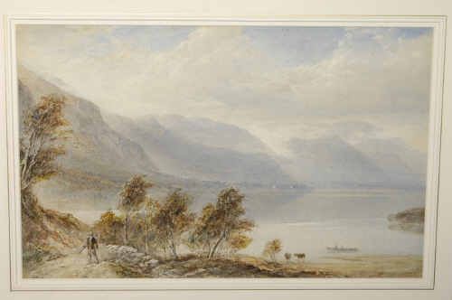 | Lakeland Landscape with a Figure on a Path in the Foreground, cattle and a boat nearby | |