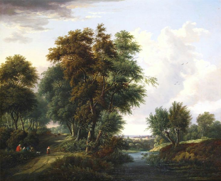 A wooded river landscape