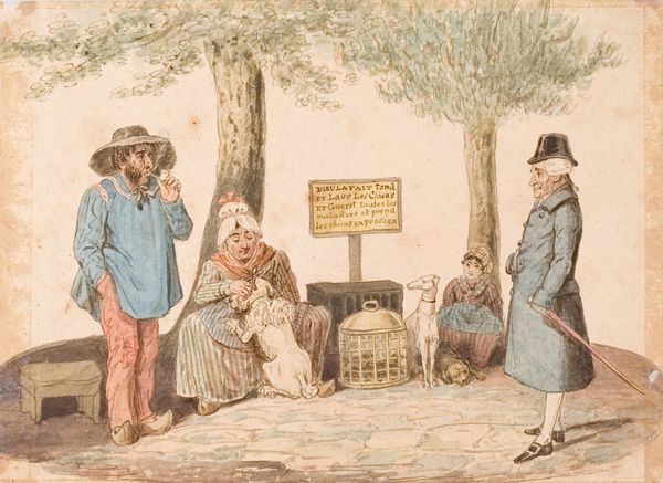 | This drawing is an obvious social statement depicting a peasant family with their pets gathered together beneath trees in a par | |