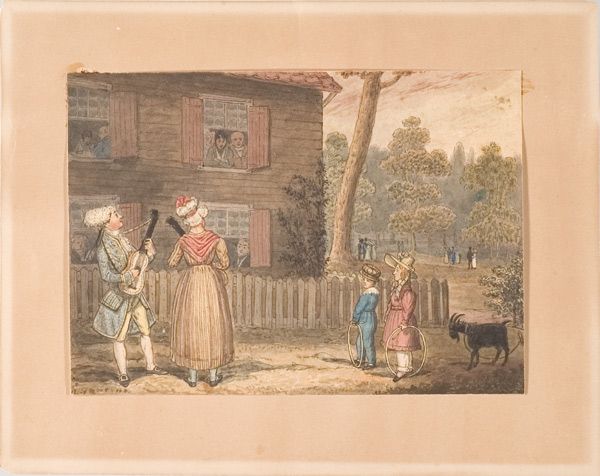 | This illustration shows a charming country scene depicting a male and female musician serenading patrons in what appears to be a | |