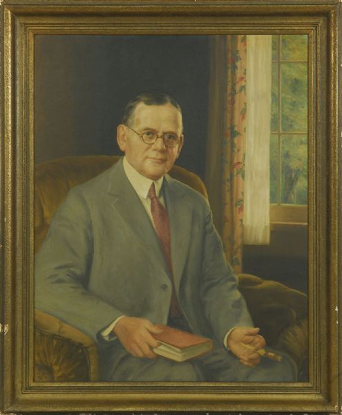 Portrait of a seated gentleman holding a book and a cigarette holder.