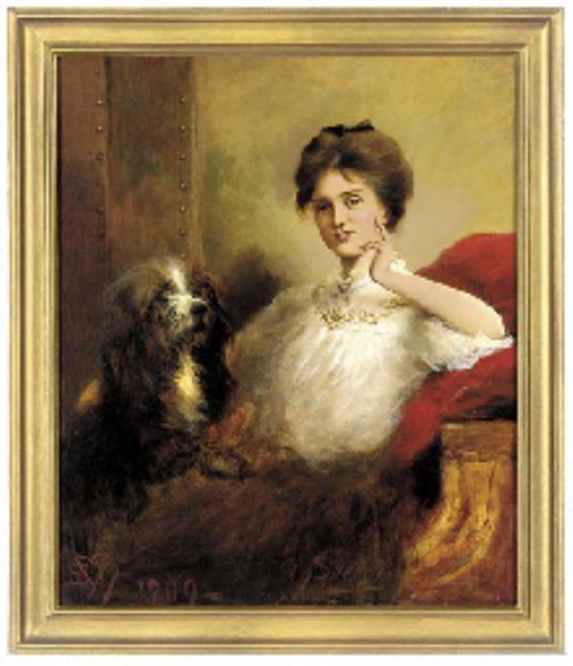 | Portrait of a lady, seated three-quarter-length, in a white blouse with lace trim, a terrier to her side | |