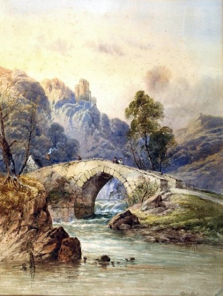 | Near Ambleside - River landscape with figures on a bridge and castle and mountains to background | |