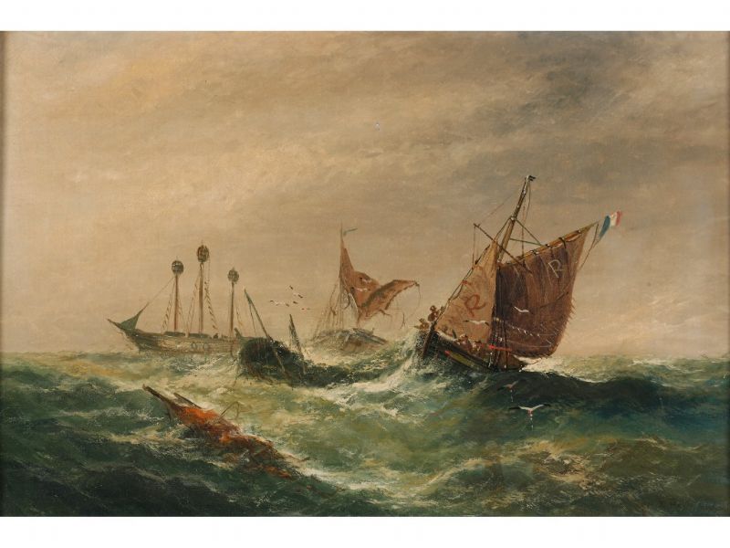 | SHIPWRECK IN A STORMY SEA depicting a small fleet of fishing vessels caught up in a raging storm | |