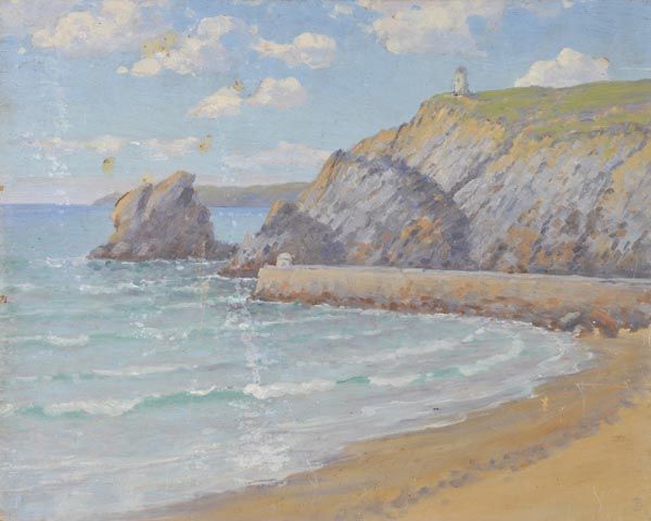 British coastal scene with lighthouse on a rocky headland beside a sandy beach