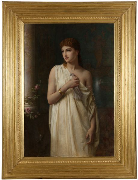 Portrait of a woman in Greco-Roman dress in an interior holding a pigeon