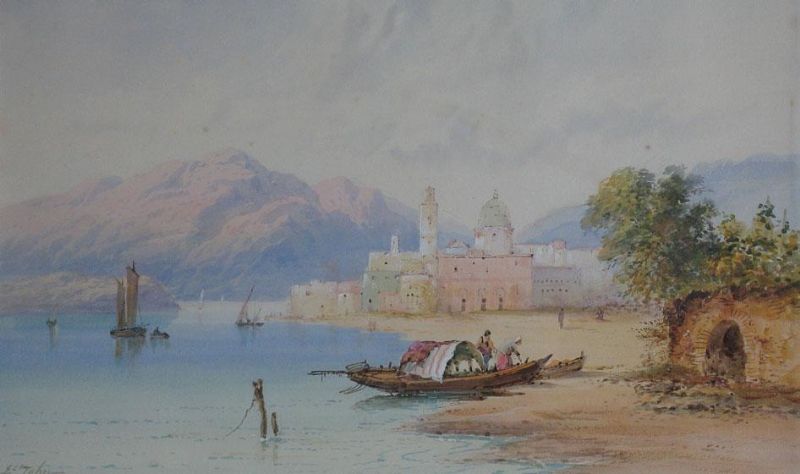 | View of Amalfi from the lakeside with fishing boats in the foreground and mountains in the distance | |