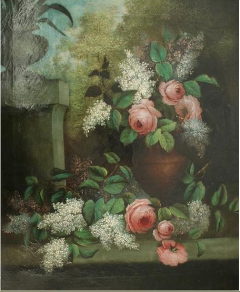 URNS OF ROSES AND ELDERFLOWERS UPON A LEDGE