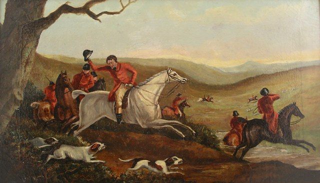 The hunt in full cry, in the foreground a rider urging his horse on