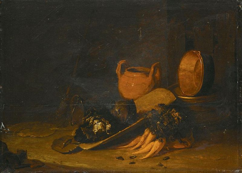 | A STILL LIFE WITH A TERRACOTTA URN, A COPPER BASIN, CABBAGES AND CARROTS, SET IN A BARN INTERIOR | |