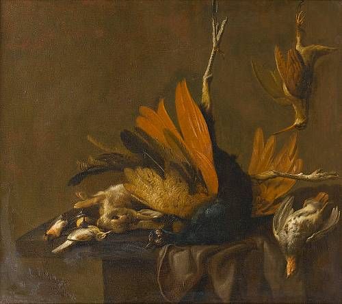 A peacock, rabbit, partridge, woodcock and songbirds on a draped table