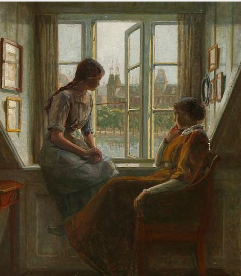 | Interior with mother and daughter looking out through the window | |