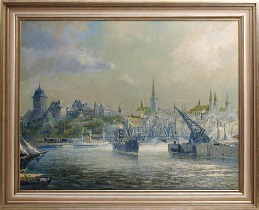 Morgendlicher Blick auf den Hafen von Lübeck, im Vordergrund einige auslaufende Dampfer