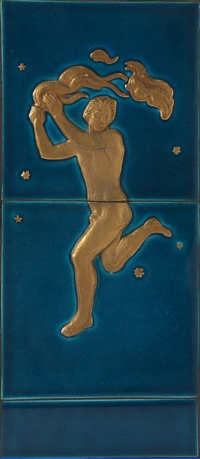 | Wall relief of stoneware consisting of three tiles modelled with running figure holding torch. | |