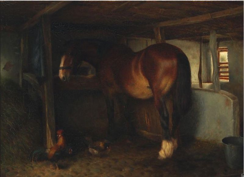 Interior from a stable with horse and fowls