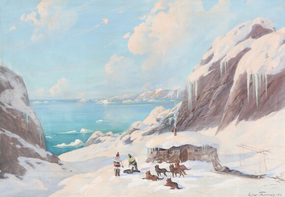 Inuit with their sled dogs at a Greenlandic fiord.