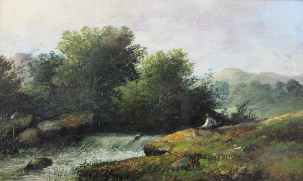 | a Scottish Highlands scene, with man fishing beside a waterfall stream, and mountainous scenery behind | |