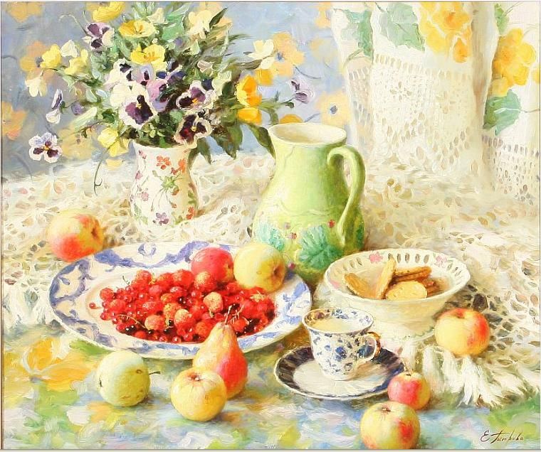 Porcelain, cookies and various fruits on a table