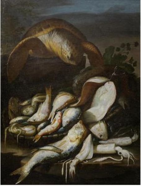 A sea turtle with an assortment of fish and squid spilling from a basket