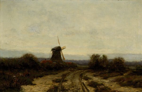 Molen en enkele huizen aan een zandweg