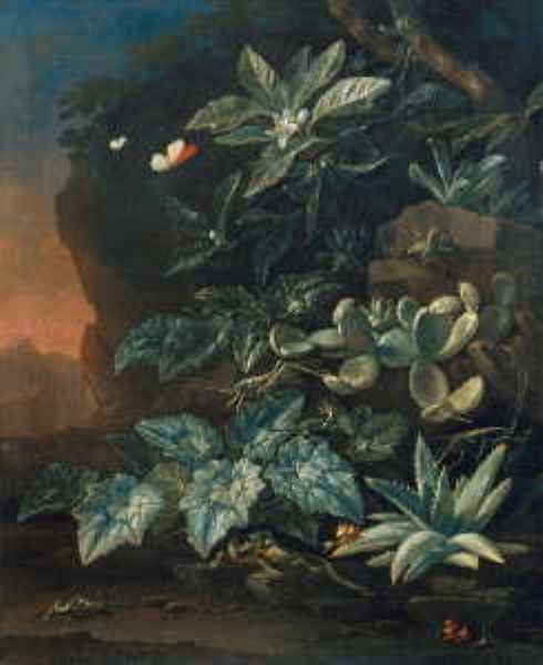| ABENDLICHE LANDSCHAFT MIT GROSSBLÄTTRIGEN KRÄUTERN, ORANGENZWEIG UND KAKTEEN. IM VORDERGRUND DREI EIDECHSEN, ZWEI HEUSCHRECKEN U | |