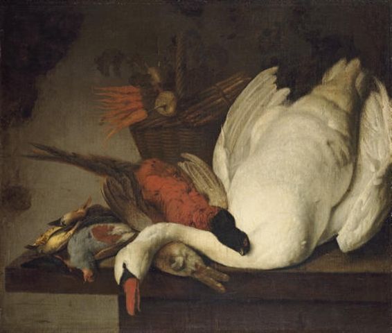 A dead swan, pheasant, rabbit, grouse, finches and a basket of carrots and onions on a stone table