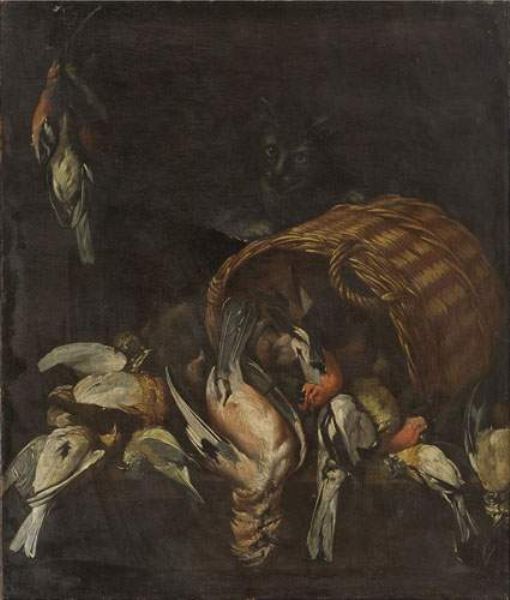 Stilleben mit Vögeln und Katze