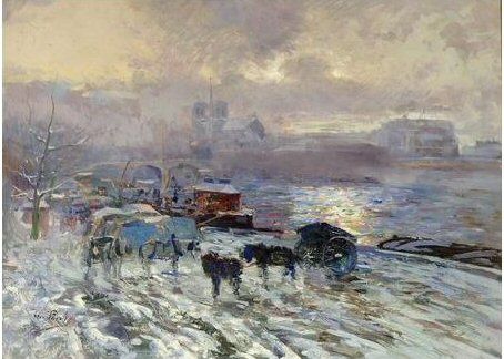 PARIS, LES QUAIS SOUS LA NEIGE DERRIERE NOTRE DAME