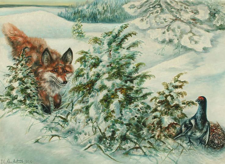 Winter scenery with a fox and birds.