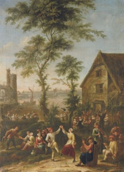 A village kermesse with figures feasting by a house, a harbour and a ruined gate beyond